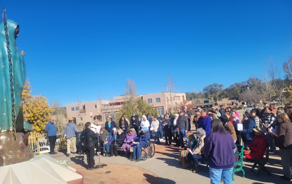 Gilbert Martinez leading a prayer at the Santa Fe Day of Prayer event at Our Lady of Guadalupe statue,