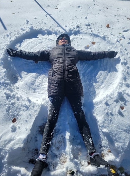 Camille Quintana making a snow angel in front of Planned Parenthood office during a Saturday vigil